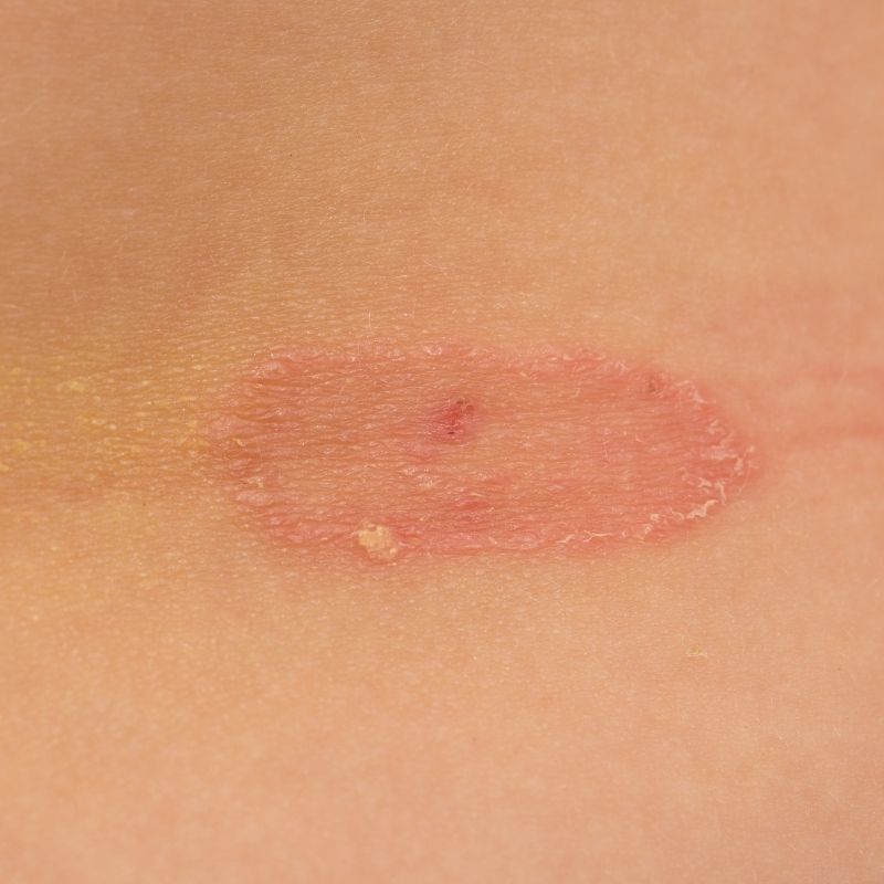 Ringformede, let røde og skællende pletter, som gradvist breder sig udad (ringorm).